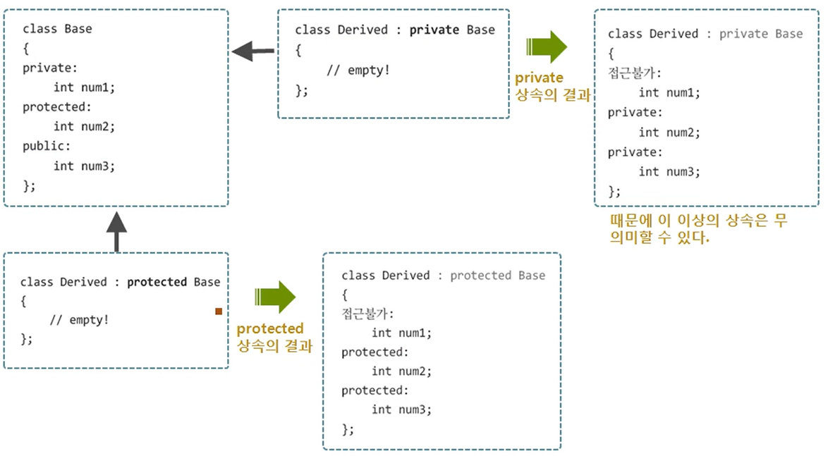 이 그림의 예시처럼 기존의 멤버의 접근 권한 설정이 상속에 따라서 바뀐 것을 볼 수 있다.
