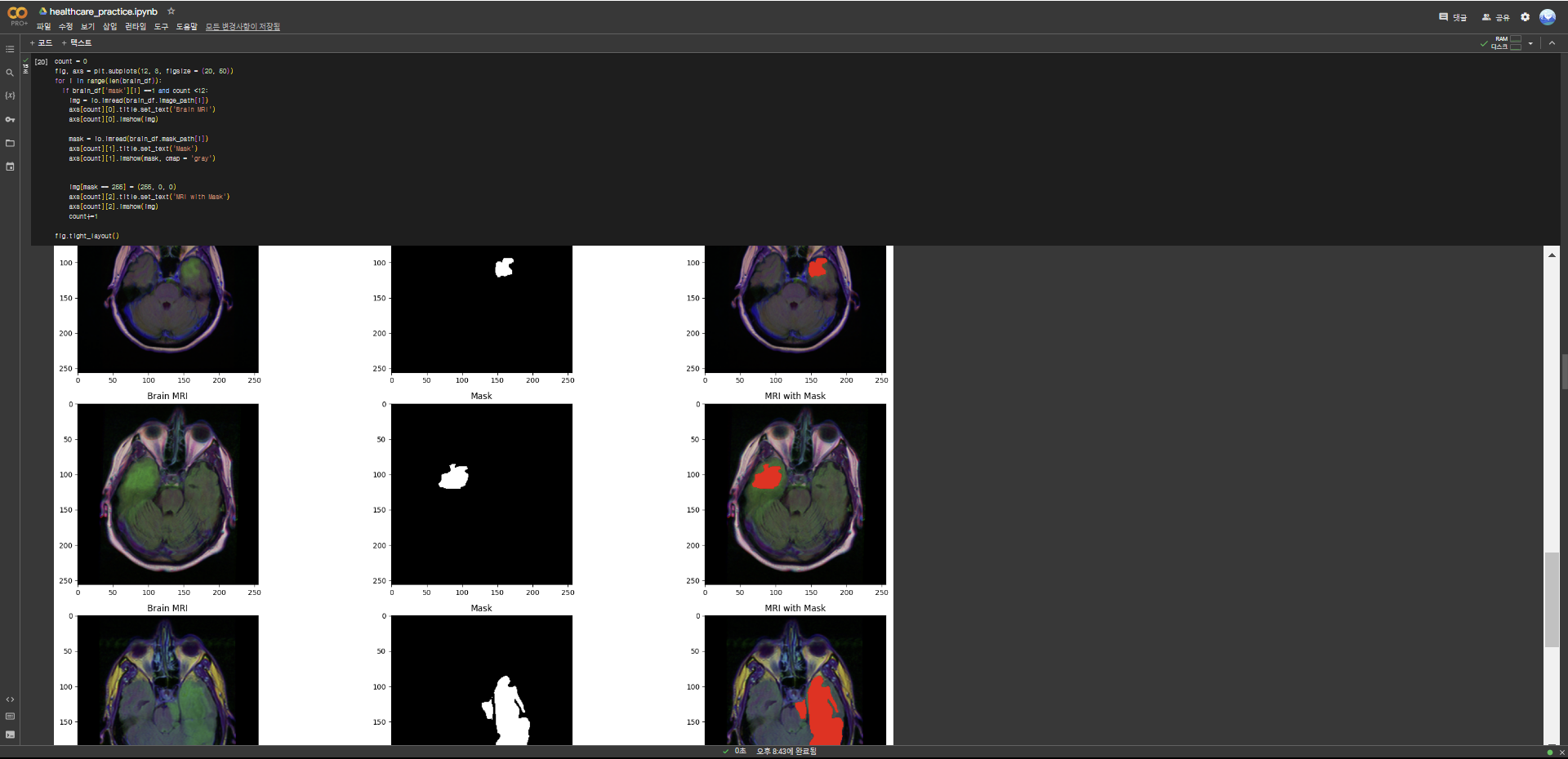 오늘은 두 번째 프로젝트의 내용으로 노트를 작성하고자 한다. 의료계 AI 강의로써 MRI 스캔을 기반으로 뇌종양을 인식하고 위치를 국소화하는데에 속도와 정확도를 개선하는 강의 내용을 담고 있다. 3900 장의 뇌 MRI 데이터를 활용해 뇌 종양의 유무를 확인하는 모델, 종양이 있을 시 ResUnet 모델을 통해 종양 위치를 국소화 시키고 세분화하는 내용으로 보다 조금 더 심화된 딥러닝 강의로 느껴졌다