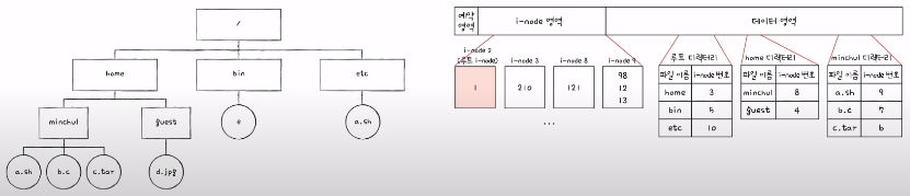 i-node 영역에서 2번을 통해 1번 블록의 루트 디렉토리를 읽음 (루트 디렉토리는 2번이 고정)
