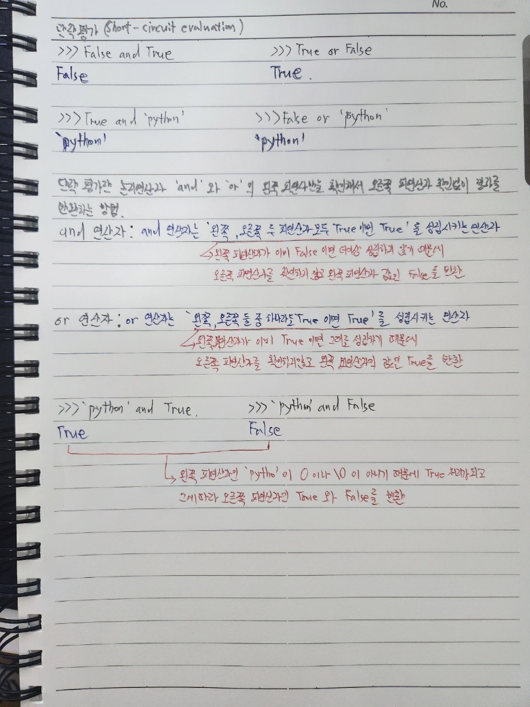 - True or False 코드에서 왼쪽 피연산자가 True 이어서 <둘 중 하나라도 True 이면 True>가 성립되기 때문에 오른쪽 피연산자를 평가하지 않고 왼쪽 피연산자( True )를 반환한다.