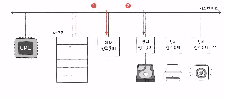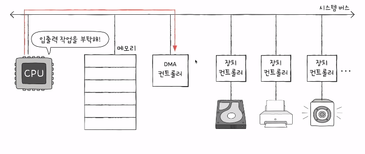 2. DMA 컨트롤러는 CPU 대신 장치 컨트롤러와 상호작용하면 입출력 작업을 수행한다.