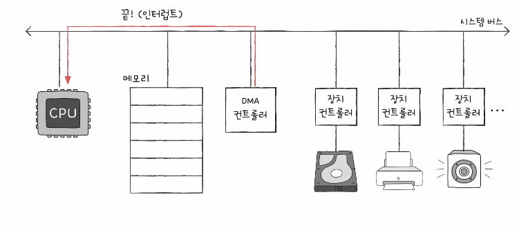 3. 입출력 작업이 끝나면 DMA 컨트롤러는 인터럽트를 통해 CPU 에 작업이 끝났음을 알린다.