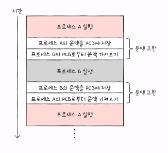 - 문맥(context)이란 기존에 실행되던 프로세스의 중간 정보(중단되기 전까지의 정보)를 칭하는 것으로 프로그램 카운터등의 각각의 레지스터 값, 메모리 정보, 열었던 파일, 사용한 입출력 장치등의 상태들을 백업해둠으로써 다음 차례가 왔을 때 실행을 재개하기 위해 백업해둔 정보를 해당 프로세스에 맞춰서 바꿔주는 작업이다.