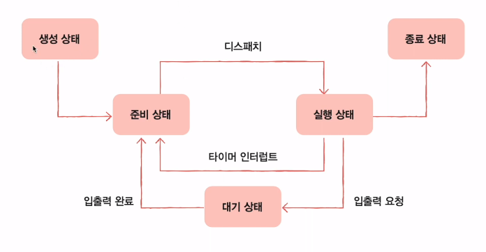 실행 상태 - CPU를 할당받아 실행 중인 상태로 할당된 시간 모두 사용 시(타이머 인터럽트 발생시) 다시 준비 상태로 돌아가고, 실행 도중 입출력장치를 사용하면 입출력 작업이 끝날 때까지 대기 상태로 넘어간다.