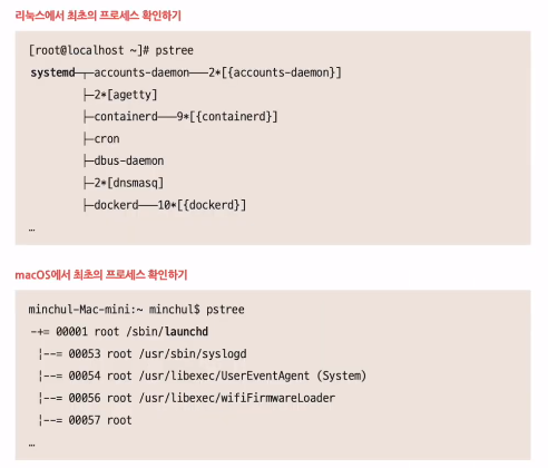 최초의 프로세스는 pstree 명령어를 통해서 확인할 수 있다.