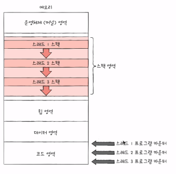 그림처럼 스레드 1, 2, 3 이 병행 실행이 되어도 똑같은 코드, 데이터 영역을 공유하고 있다. 즉 각각의 스레드가 각각의 코드, 데이터 영역을 갖고있지 않다는 얘기다.