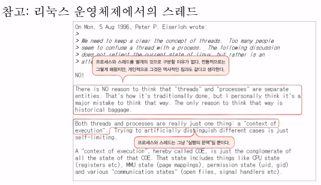Linux 창시자 리누즈 토발즈는 위의 내용과 같이 프로세스와 스레드를 구분할 필요가 없다고 말한다.