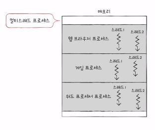 - 프로세스를 구성하는 실행 흐름의 단위로 하나의 프로세스는 하나 이상의 스레드를 가질 수 있다.