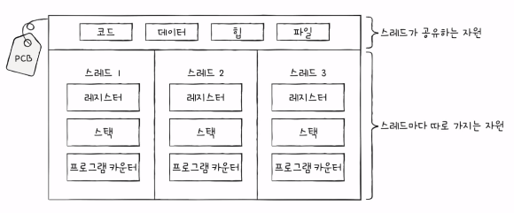 프로세스끼리는 자원을 공유하지 않지만 스레드끼리는 같은 프로세스 내 자원을 공유하는 큰 차이점이 있다.