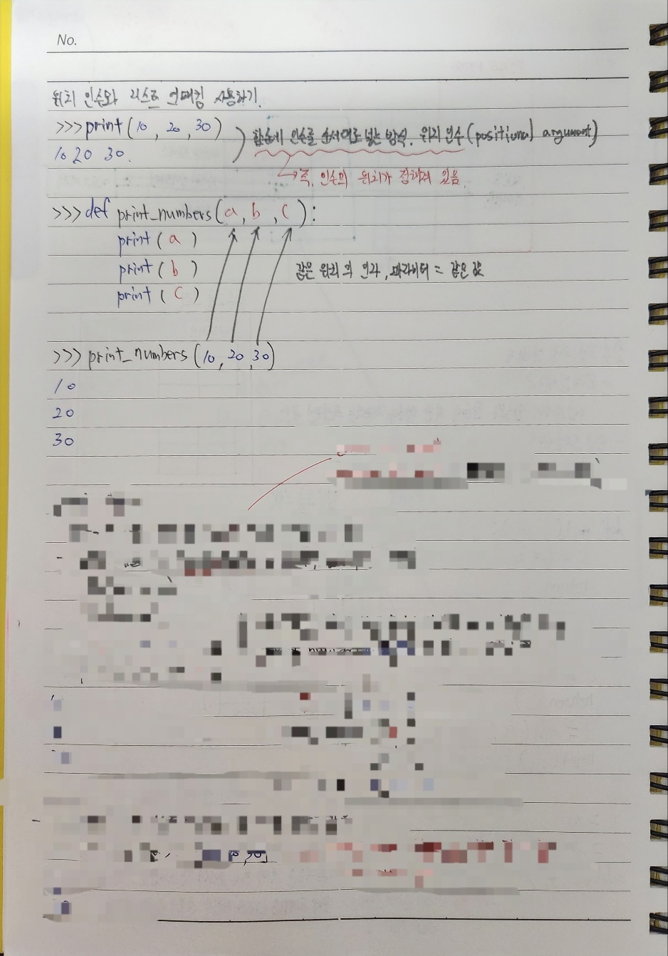 - print_numbers(10, 20, 30) 사용자 함수 print_numbers() 의 argument 로 10, 20, 30 을 순서대로 넣었으니 def print_numbers(a, b, c): parameter 인 a, b, c 순으로 10, 20, 30 이 대입되게 된다.