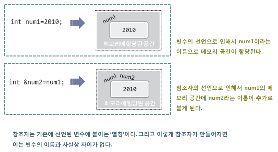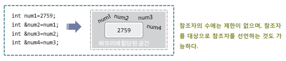 int &num2 = num1; // num2 는 num1 의 참조자이다.
