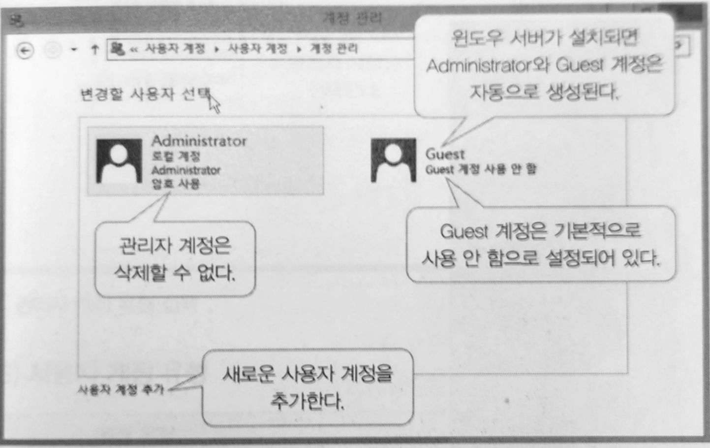 | 관리자(Adminstrator) | 윈도우 서버를 관리할 수 있는 모든 권한을 가지고 있음 |
