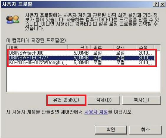 | 로컬 사용자 프로필 | 윈도우 시스템에 직접 로그인하는 사용자 정보 사용자 로그린 구성 정보, 인터넷 환경, 바탕화면 등의 정보를 제공 C:₩Documents and Settings ₩사용자 ID에 저장 |