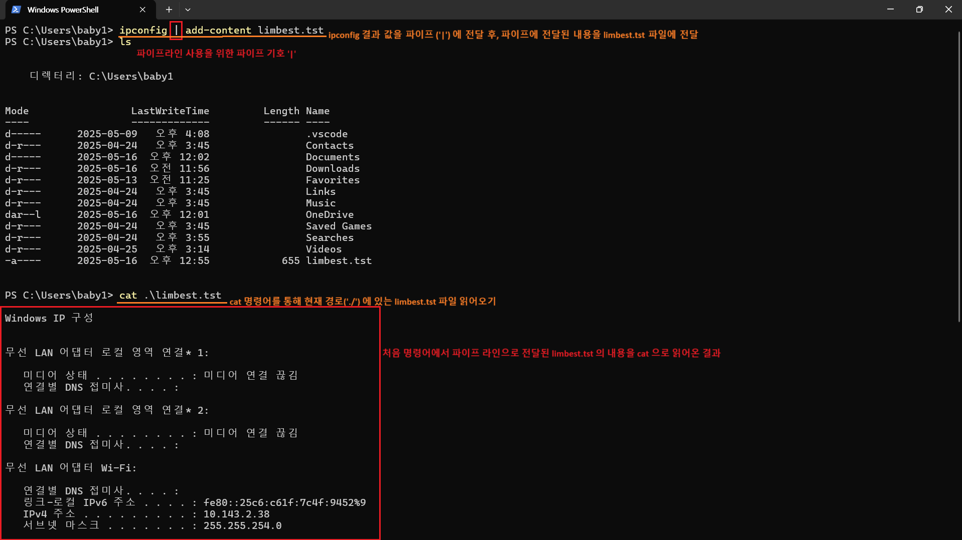 - 파이프라인 문자를 사용해서 첫 번째 명령의 결과를 다음 명령의 입력으로 전달한다.