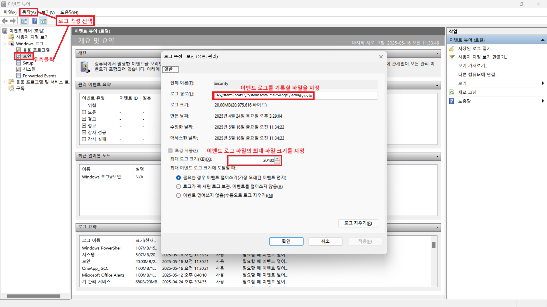 - 이벤트 파일명과 최대 로그 크기, 덮어쓰기 옵션을 로그 속성 설정 메뉴에서 설정할 수 있다