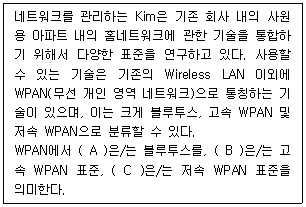 22. 다음은 Home Network에 사용되는 기술 중 WPAN(Wireless Personal Area Network)에 대한 설명이다. (A),(B),(C) 안에 들어갈 표준을 순서대로 나열한 것은?