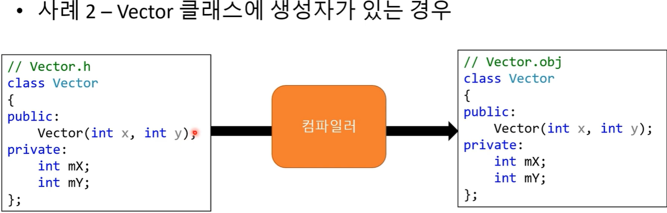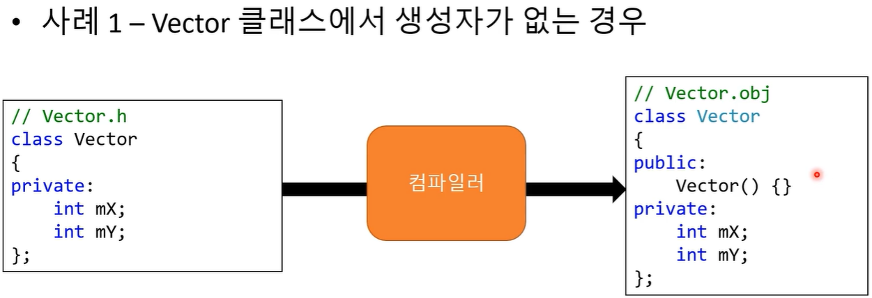- 클래스에 생성자가 없으면 컴파일러가 기본 생성자를 자동적으로 만들어줌